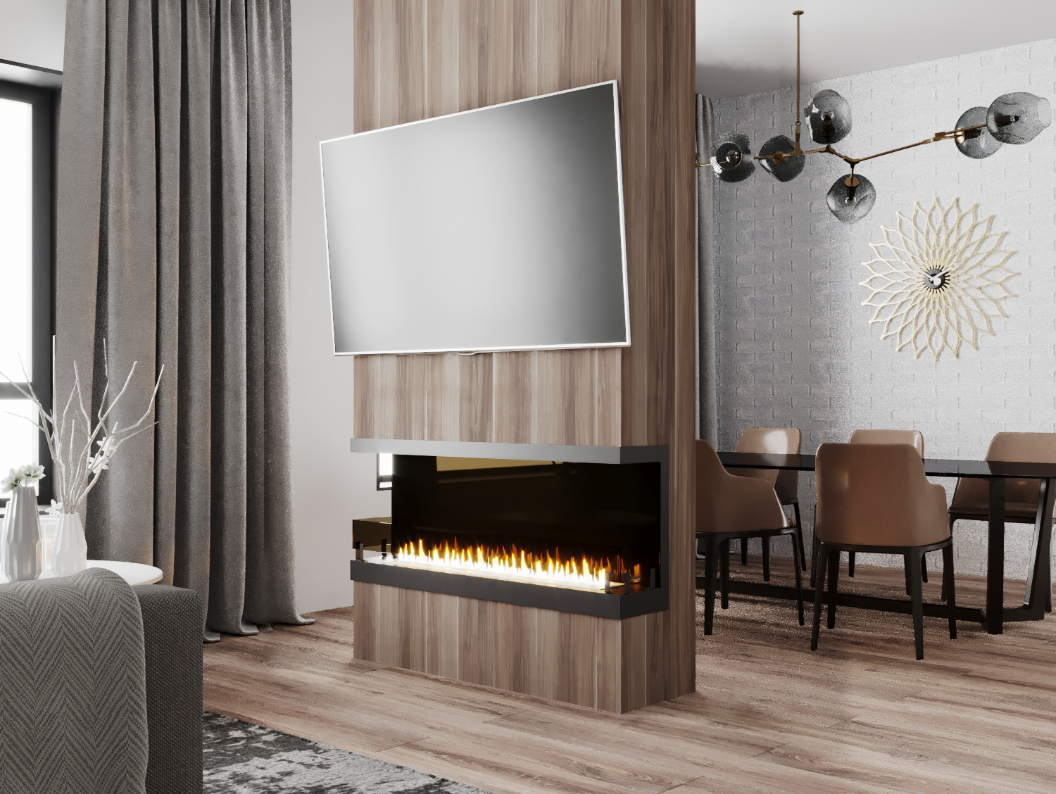 Встраиваемые варианты разделяются на такие как классические, устанавливаемые в подготовленное отверстие в стене или нише. Угловые, которые монтируются в угловую часть стены. Торцевые – открытые с трёх сторон. И сквозные, вид живого огня которых доступен в разных комнатах.