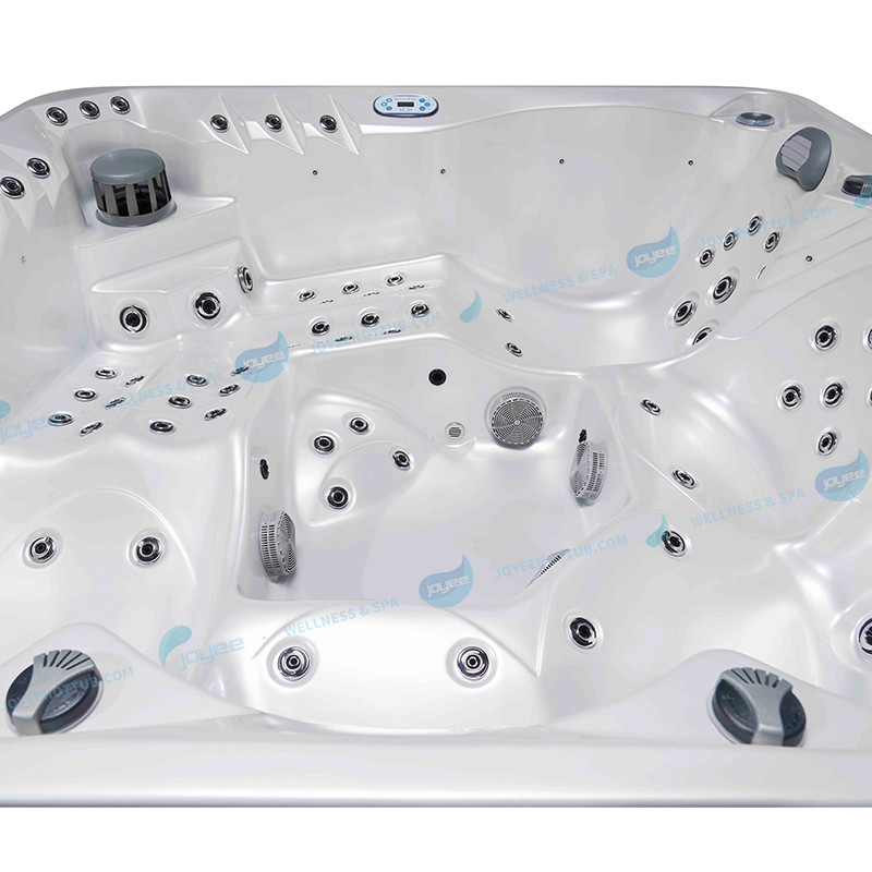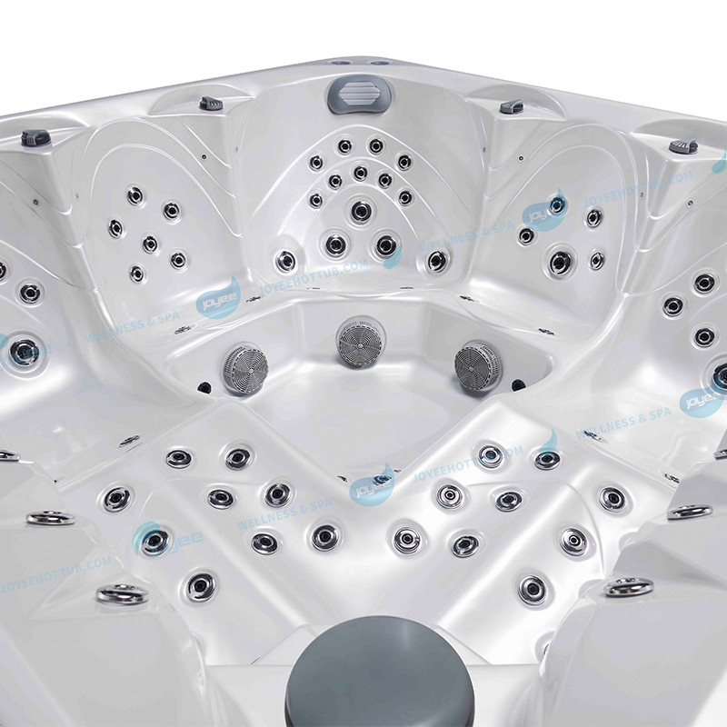 Размеры бассейна около 210×210 см позволяют комфортно разместить до 5 человек, включая лежачие и сидячие места.